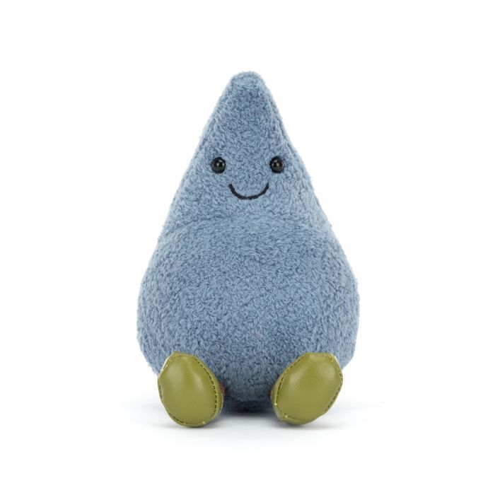 Amuseables Happy Raindrop is a drop of pure joy. Formed of textured blue fur, this smiling raindrop has fine cord cocoa legs, and is sporting a pair of olive green rain boots. The perfect companion for splashing around on a rainy day!