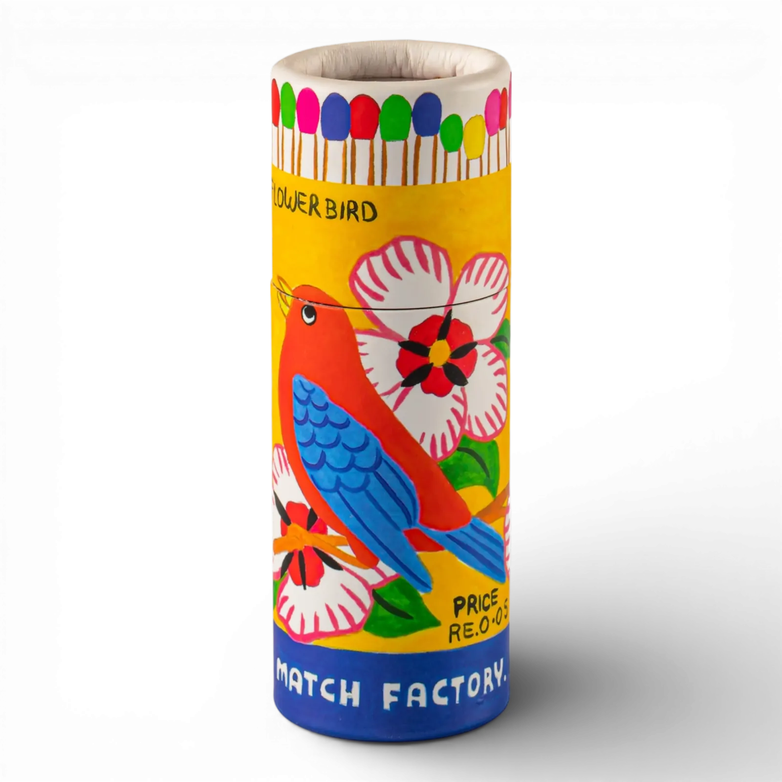 Our small cylinder matches featuring a vibrant illustration of a red and blue bird sitting among the flowers.