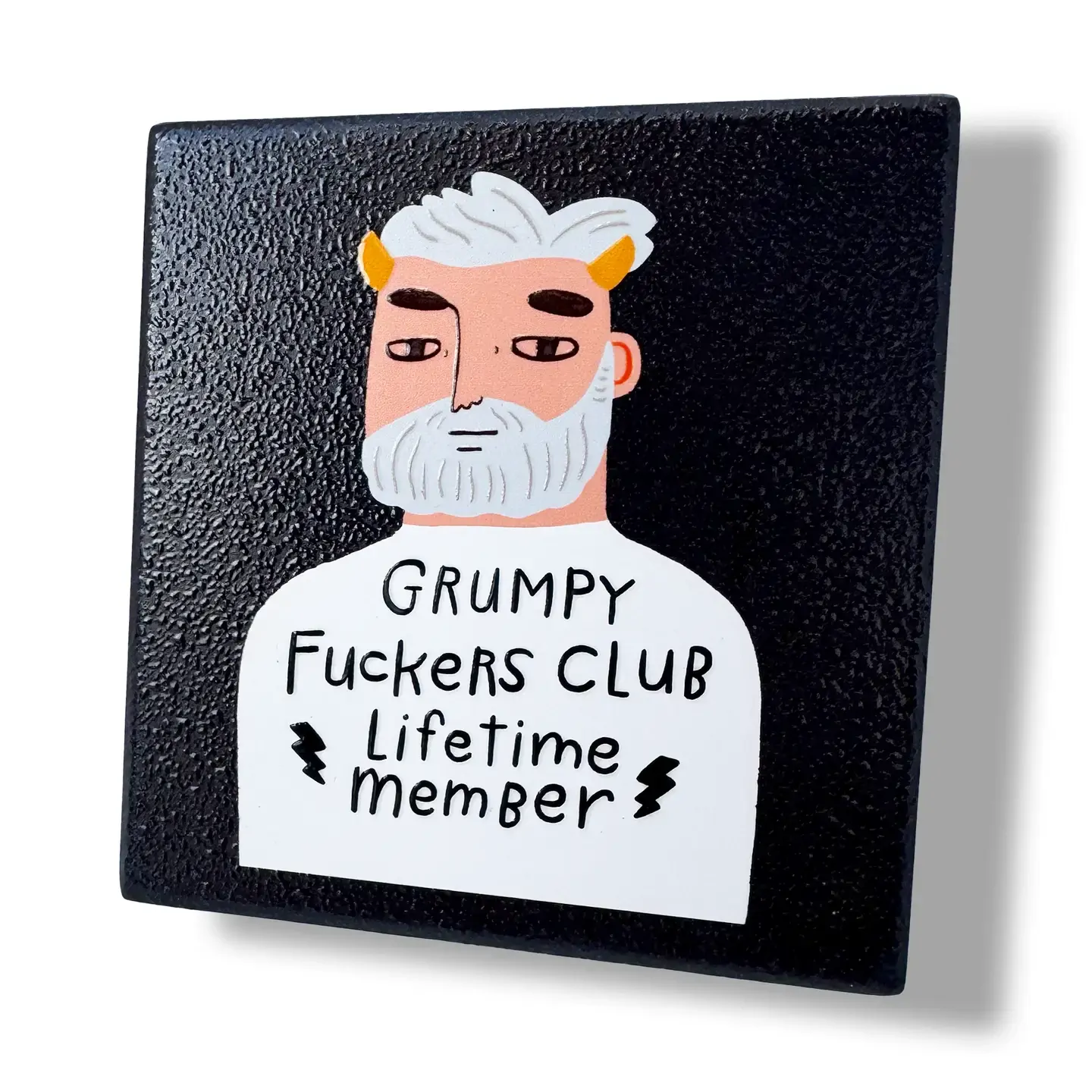 (Featuring one permanently unimpressed bloke with raised UV detail) Welcome to the Grumpy Fuckers Club, where every day is too bloody early, every person is too loud, and every meeting could’ve been an email. This premium ceramic coaster proudly declares your lifetime membership — no application needed, just a bad attitude and a short fuse. Featuring a gloriously cranky man who looks like he’s just been asked to smile for a photo, this masterpiece comes with raised UV detail so even the wrinkles of disapproval pop. It’s glossy, sturdy, and absolutely done with everyone’s shit. Perfect for your morning coffee, your evening whisky, or any beverage you sip while silently judging the world.