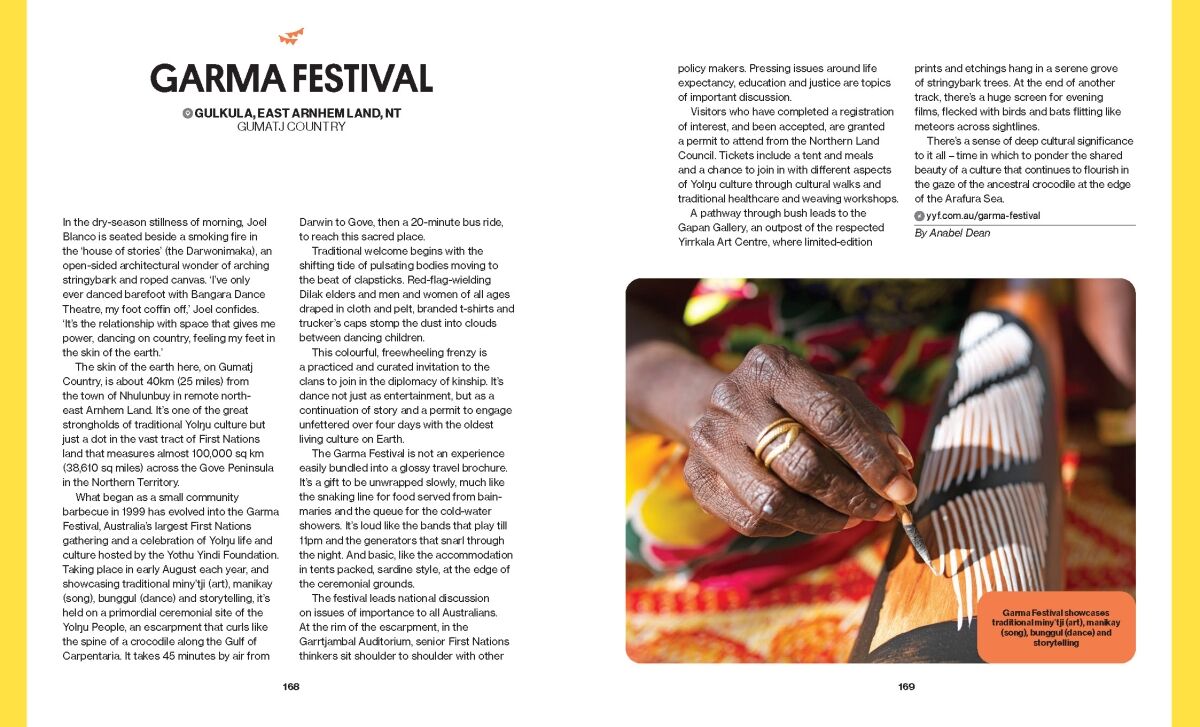 This guidebook will inspire you to discover new destinations or see the classics from a different perspective. Immerse yourself in the beauty of the Australian landscape by visiting the gorges of the Kimberley or following the fagus pilgrimmage at Cradle Mountain. Participate in the excitement of Garma Festival in Arnhem Land or cheer on the teams at the Tiwi Islands Grand Final Weekend. Challenge yourself to go outside your comfort zone by ziplining off Perth's Matagarup Bridge or visit a turtle rehabilitation at Fitzroy Island. From coast to outback, there is something to satisfy the interests of any visitor.