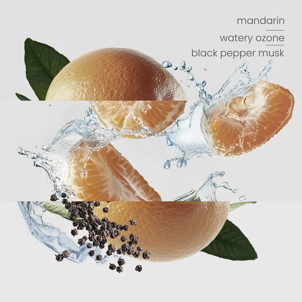 This is a premium fragrance that begins with mouth-watering mandarin, fresh watery ozone and green cardamom notes. The scent is supported by black pepper and musk to create a comfortable and confident atmosphere. This scent is slightly masculine and injects a sensation of energy and class.