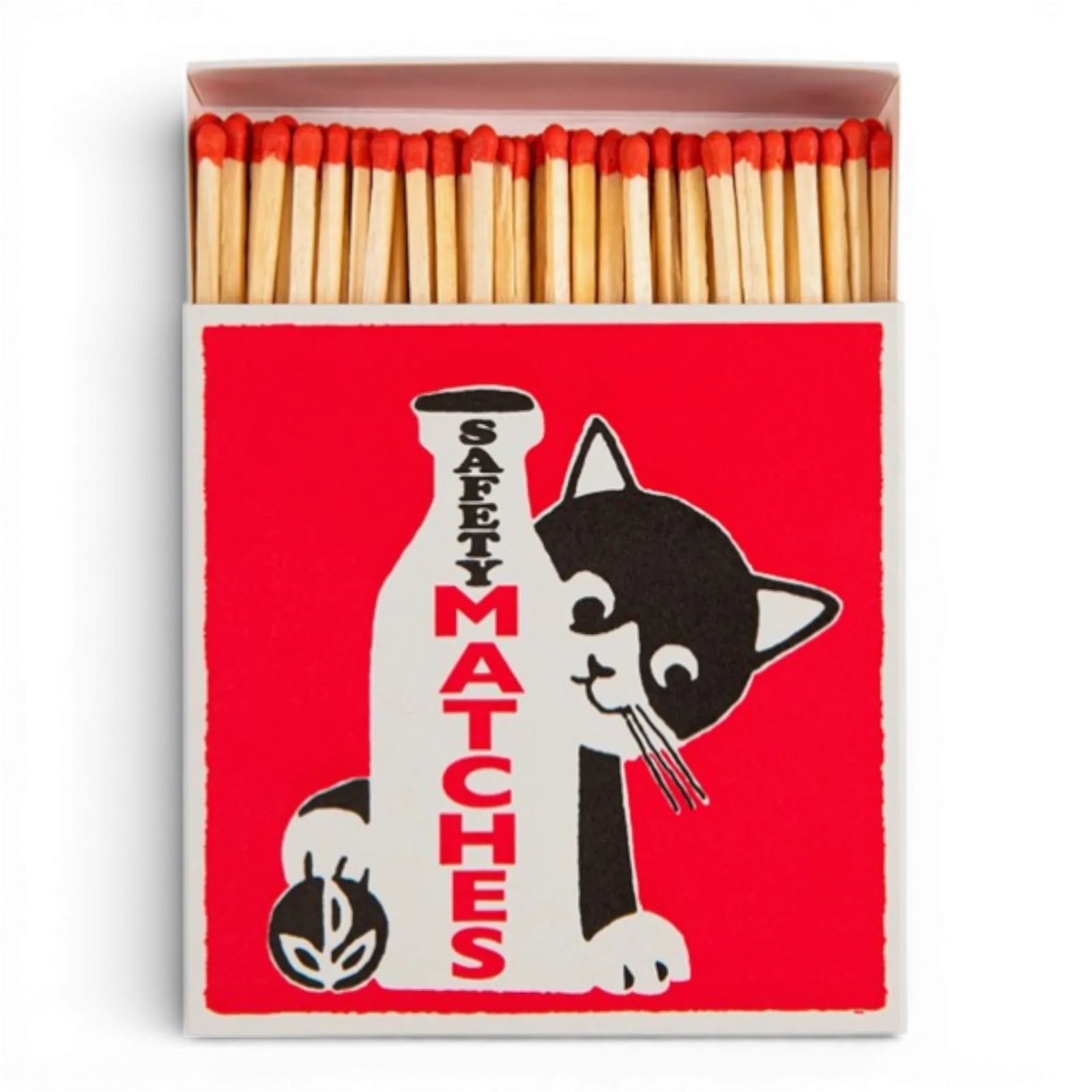 Our signature square matchbox featuring a black and white cat peeking around a milk bottle that contains the words 'safety matches.'