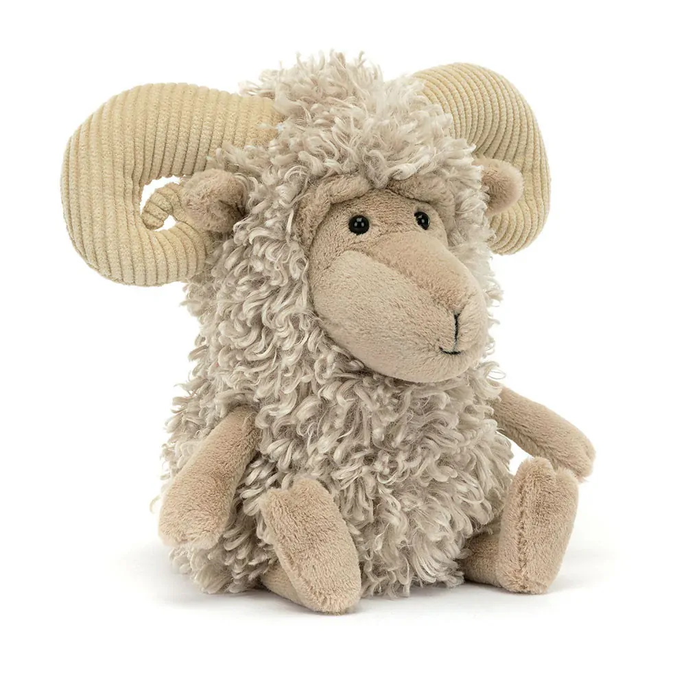 Ramsley Sheep is the littlest bighorn in the herd. With a coat of tousled, textured beige fur and soft beige limbs with cloven hooves, Ramsley has an expressive face and large, curly cord horns. The perfect companion for any hiker or wanderer.