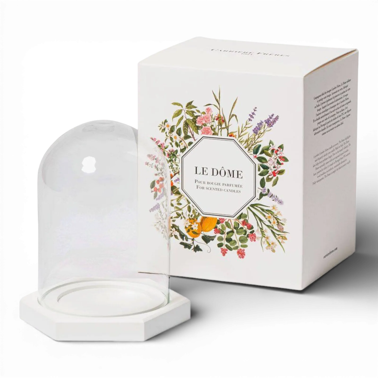 A perfect Carrière Frères candle accessory, The Dome highlights and elegantly shields your scented candle. Made in Italy, The Dome also helps keep the perfume longer. True to the brand’s identity, The Dome naturally comes with an octagonal-shaped wooden base painted in white.