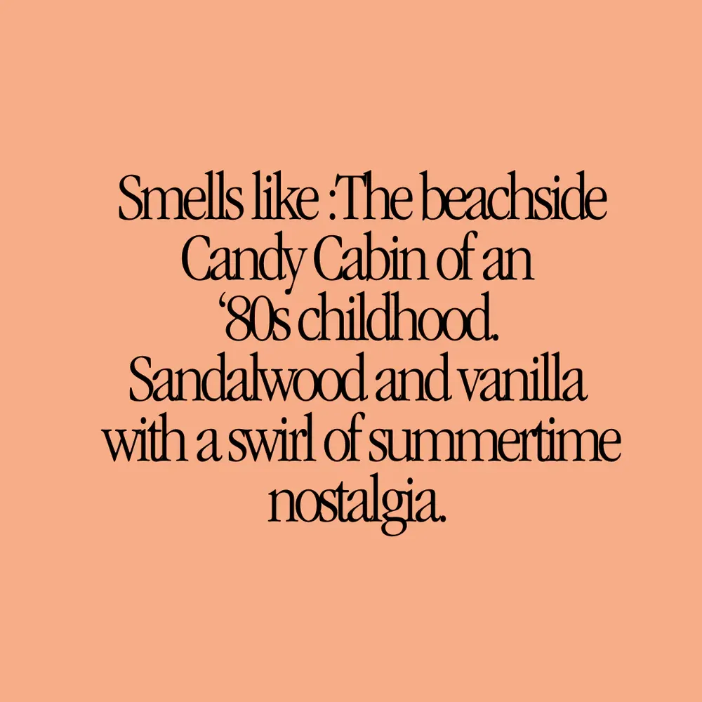 (Smells like) The beachside Candy Cabin of Sophie’s 80s childhood. Sandalwood and vanilla with a swirl of summertime nostalgia.