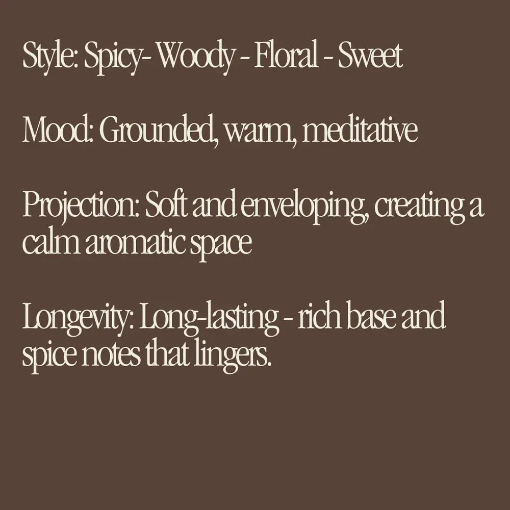 This uniquely complex scent features 11 essential oils, blended to capture the essence of a daily grounding ritual. The deep base notes of Australian Sandalwood and Ylang Ylang mindfully blend with heart notes of Nutmeg, Cinnamon and Clove, leaving a lingering sweet aroma in the air.