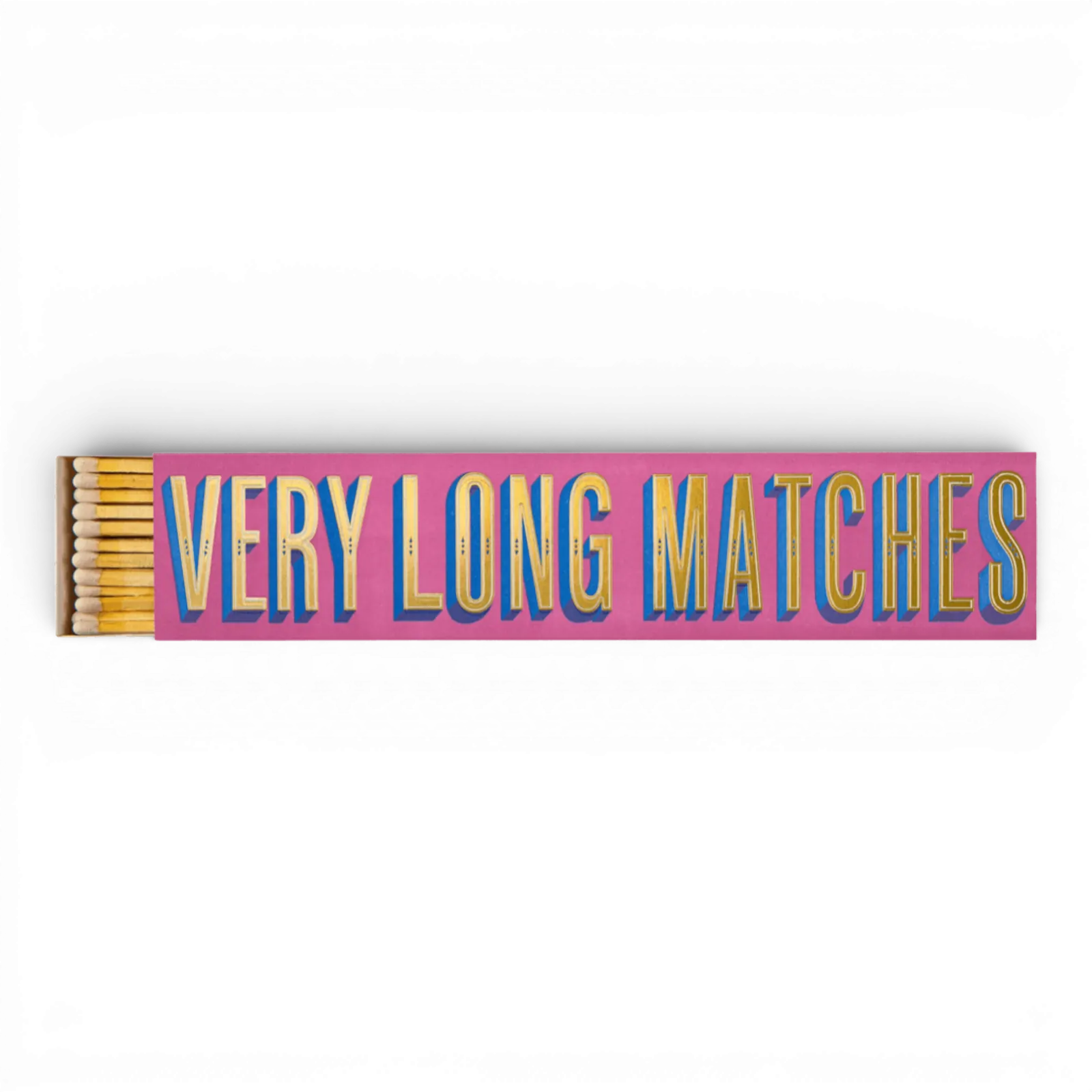 Our long matchbox featuring the words 'Very Long Matches' in gold foil with a two-tone blue shadow on a deep pink background.