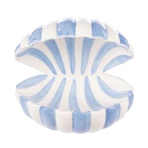 Zona Clam Dish brings nautical charm to your space with soft blue and ivory stripes and clam shape.